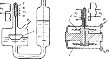 Полости коробок сообщаются и заполнены дистиллированной водой. Измеряемая разность давлений деформирует коробки и перемещает плунжер дифференциально-трансформаторного преобразователя 3. Перемещение плунжера, следовательно, и выходная ЭДС пропорциональны разности давлений. Диапазоны измерения таких дифференциальных манометров лежат в пределах от 1,6 до 630 кПа. Основная погрешность в комплекте с вторичным прибором не превышает ± 2 %.