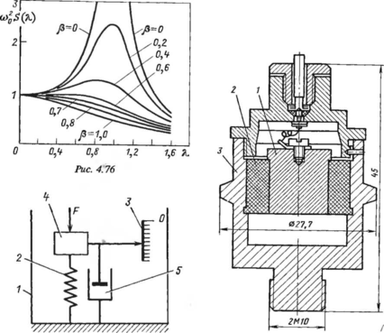 Измерение динамических сил и давлений. Датчик силы в обшем случае строится по схеме, показанной на рис. 4.78. Он состоит из корпуса 1, к которому одним концом прикреплена пружина 2; на второй (подвижный) ее конец действует сила F. С подвижным концом соединен преобразователь перемещения в электрическую величину или устройство отсчета 3. Конструктивные элементы датчика, к которым приложена сила, и устройство отсчета имеют некоторую массу 4. В зту же массу входит приведенная масса подвижных деталей источника силы. Масса вместе с пружиной образует колебательную систему. Для улучшения ее динамических характеристик иногда вводят демпфер 5, создающий силу сопротивления, пропорциональную скорости движения.