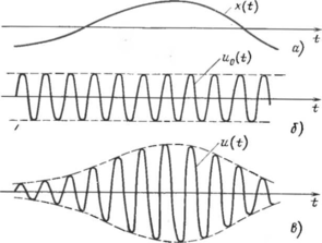 На рис. 5.2 приведены временные диаграммы, иллюстрирующие процесс амплитудной модуляции: рис. 5.2,а — функция x(t); рис. 5.2,6 — носитель и0 (г); рис. 5.2,в — модулированный сигнал ы(г)-Огибающая сигнала u(t), показанная пунктиром на диаграмме рис. 5.2,в, повторяет по форме функцию х (t) (диаграмма рис. 5.2,а).