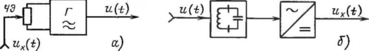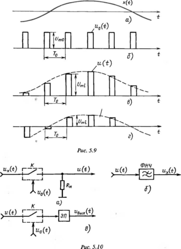 Можно представить и другой способ (рис.5.10/г): сигнал ux{t) вида (5.1) подается на сопротивление нагрузки i?H через ключ К, управляемый импульсным напряжением и0 (г) • При этом вершины импульсов сигнала и (г) на выходе получаются не горизонтальными, а повторяют по форме соответствующие участки функции х (?). Но это несущественное отличие.