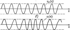 На рис. 5.6 дана графическая иллюстрация процесса частотной модуляции. Показаны функции х(0 (рис. 5.6,а), несущее колебание и0 (г) (рис. 5.6,6) и модулированный сигнал u{t) (рис. 5.6,в). Сгущения и разрежения волн на диаграмме рис. 5.6,в соответствуют увеличению и уменьшению частоты.