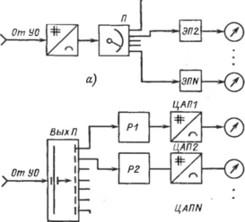 Как показано на обобщенной структурной схеме рис. 5.43, в числе получателей информации с выхода устройства обработки (УО) находятся аналоговые приборы (АП) (показывающие и регистрирующие). УО выдает информацию в виде параллельных цифровых кодов. Для вывода в аналоговые приборы ее требуется обработать цифро-аналоговыми преобразователями (ЦАП). Наиболее экономична по числу используемых блоков схема вывода информации с групповым ЦАП, приведенная на рис. 5.46,а. В соответствии со сменой кодовых сигналов на выходе УО работает переключатель ВыхП, распределяя аналоговые сигналы с выхода ЦАП по индивидуальным цепям. В каждую из них входят аналоговый элемент памяти (ЭП) и аналоговый прибор (АП). Элементом памяти может, например, служить конденсатор с усилителем на выходе. Выходной переключатель в данном случае не отличается принципиально от входных переключателей аналоговых сигналов.