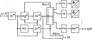 Далее на схеме приемника показаны два вида выходных цепей: а) для воспроизведения на аналоговых приборах; б) для воспроизведения на цифровых приборах. В цепях обоих видов на входе установлен триггерный регистр Р для запоминания информации. После регистра в случае аналогового воспроизведения устанавливается цифро-аналоговый преобразователь, а в случае цифрового воспроизведения — преобразователь* кода ПК!"В частности, это может быть набор нескольких декадных дешифраторов^ показанных на рис. 5.34 (если для передачи по каналу связи используется двоично-десятичный код). Информация с выхода ПК (в виде параллельных кодов) может вводиться в цифровое устройство обработки УО. При этом она сопровождается адресными кодами (т. е. кодами номеров параметров), снимаемыми с блока управления БУ."