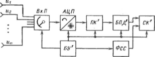 За групповыми нормализующими преобразователями следует вторая ступень коммутации. Эту функцию выполняет переключатель ВхП'. Данный переключатель рассчитан на коммутацию таких же сигналов, как ВхП в схеме рис. 5.44,а, но он имеет меньшее число каналов и меньшую частоту переключений. Последующая часть рассматриваемой схемы такая же, как у предыдущей схемы.