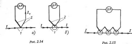 зличают контактные (рис. 2.14, а) и бесконтактные (рис. 2.14, б) термопреобразователи. В первом случае термопара имеет электрический контакт с нагревателем (ее спай приварен непосредственно к нагревателю) , а во втором имеется только тепловой контакт нагревателя и термопары через изолирующий материал, обладающий хорошей теплопроводностью (стекло, керамика). Контактные термопреобразователи менее инерционны, чем бесконтактные, но они допускают большую утечку токов высокой частоты и применяются на частотах не выше 5—10 МГц. Бесконтактные термопреобразователи не имеют этого недостатка и могут использоваться вплоть до частот, равных сотням мегагерц. Кроме того, отсутствие гальванической связи дает возможность повысить чувствительность термопреобразователя благодаря применению батарей из нескольких последовательно включенных термопар (рис. 2.15).
