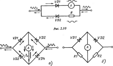 При однополупериодном выпрямлении (рис. 2.10) через рамку измерительного механизма, включенную последовательно с диодом VD1, ток проходит только в течение своего положительного полупериода. Во время отрицательного полупериода он проходит по параллельной цепочке через резистор R и диод VD2. Параллельная цепочка обеспечивает защиту диода VD1 от перенапряжения во время отрицательного полупериода. На рис. 2.10 направление прохождения прямой волны обозначено сплошной, а обратной волны — пунктирной стрелкой. Показано также, какую форму имеют токи, протекающие в различных участках цепи.