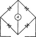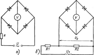 Выпрямительные приборы. Выпрямительные приборы состоят из полупроводникового диода и магнитоэлектрического измерительного механизма. Диод выпрямляет измеряемый переменный ток, а магнитоэлектрический механизм служит индикатором, стрелка которого отклоняется под действием выпрямленного тока. Наиболее употребительны точечные кремниевые диоды, которые имеют малую собственную емкость (несколько пикофарад) и могут работать в диапазоне от низких (0—50 Гц) до высоких (104 — 105 Гц) частот. Способность диода выпрямлять ток характеризуется коэффициентом выпрямления кв, представляющим собой отношение сопротивлений диода в обратном и прямом направлениях: