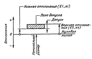 1.1.12. Основное отклонение — одно из двух предельных отклонений (верхнее или нижнее), определяющее положение поля допуска относительно нулевой линии. В данной системе допусков и посадок основным является отклонение, ближайшее к нулевой линии.