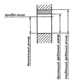 1.1.13. Нулевая линия — линия, соответствующая номинальному размеру, от которой откладываются отклонения размеров при графическом изображении полей допусков и посадок. Если нулевая линия расположена горизонтально, то положительные отклонения откладываются вверх от нее, а отрицательные — вниз (черт. 2).