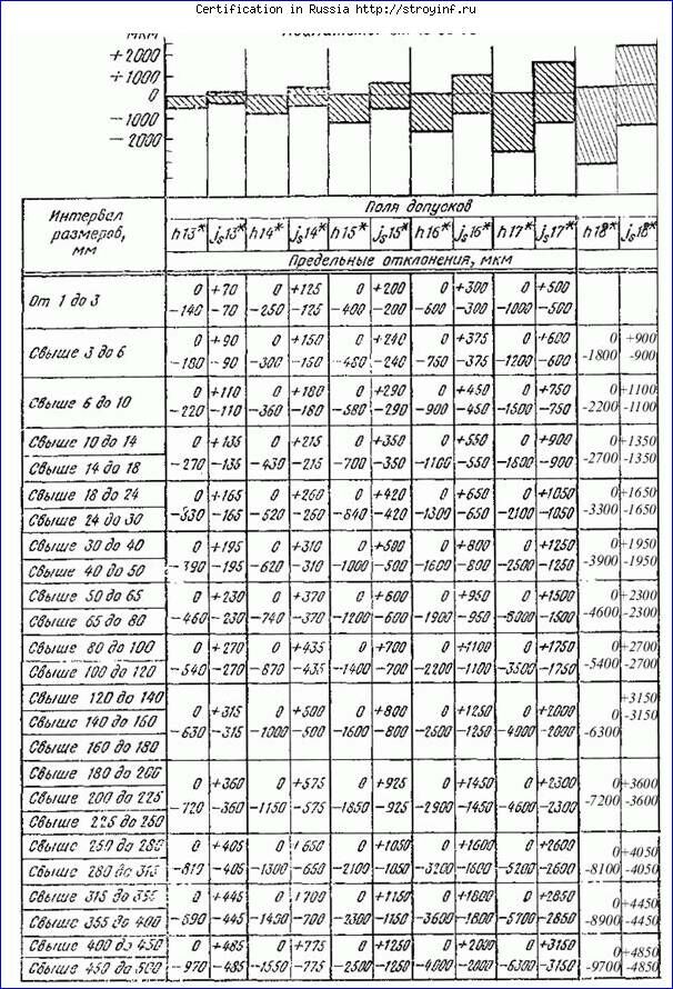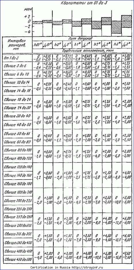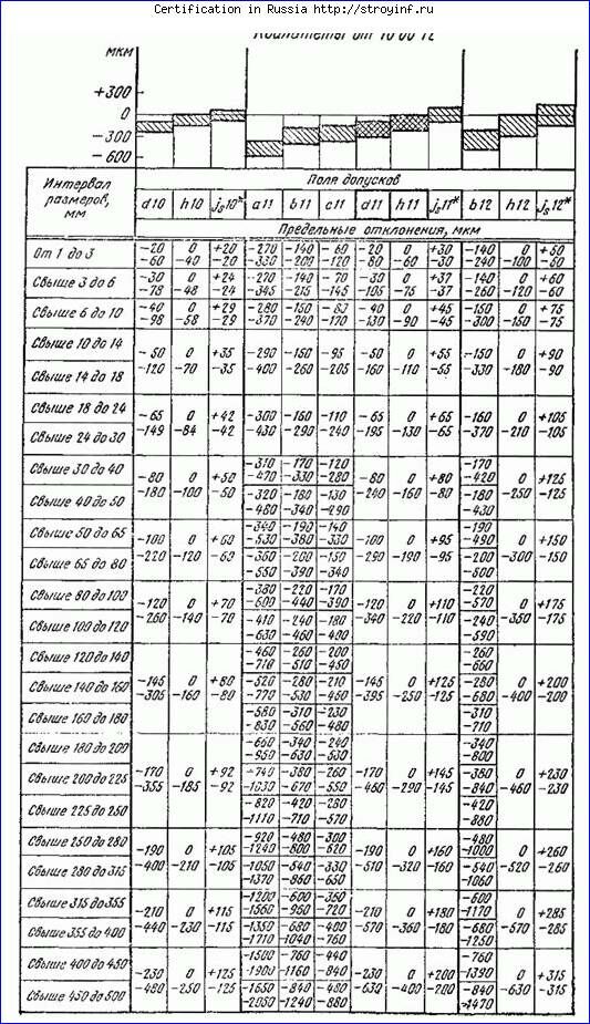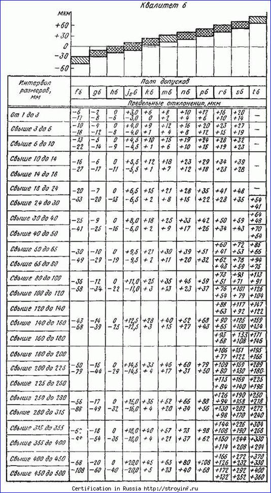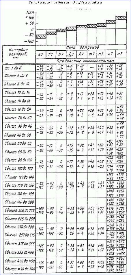 Поля допусков валов при номинальных размерах от 1 до 500 мм. Предельные отклонения