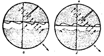 Смещение b измеряют окулярным винтовым микрометром (ОВМ). Отсчет производится по горизонтальной линии перекрестия, перемещающейся под углом 450 к направлению измерения величины (рис. 1.2.), то есть непосредственно измеряется расстояние (рис. 1.1.б). С учетом этого: