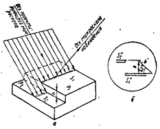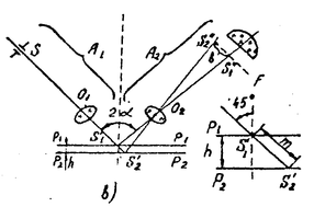 Пусть контролируемая поверхность имеет ступенчатый переход P1–P2 высотой h (рис. 1.1.а). На эту поверхность проецируется микроскопом освещенная узкая щель S (рис. 1.1.в). Отразившись от поверхности, лучи попадают в микроскоп наблюдения, расположенный под углом 900 к оси проектирующего микроскопа, причем биссектриса этого угла совпадает с нормалью к контролируемой поверхности. Объектив O2 переносит изображения щели S1` и S2` в фокальную плоскость F окуляра K, в поле зрения которого наблюдают изображение, подобное показанному на рис. 1.1.б. Смещение b изображения S2`` относительно S1`` является мерой высоты ступеньки h. Так как угол между оптической осью микроскопа наблюдения и нормалью к исследуемой поверхности равен 450, то смещение изображений щели равно: