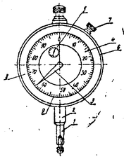 Подпружиненный измерительный стержень 1 индикатора выполнен как одно целое с зубчатой рейкой 2, находящейся в зацеплении с зубчатым колесом z1, передает вращение на зубчатое колесо z3. На оси зубчатого колеса z4 находится стрелка указателя оборотов 5 (в мм) индикатора. Зубчатое колесо z4 передает вращение на зубчатое колесо z5, на оси которого имеется основная стрелка 3 (в мкм) индикатора. Зубчатое колесо z6 подпружинено спиральной пружиной П для выборки свободного хода и находится в зацеплении с зубчатым колесом z5.