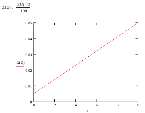 3. График зависимости максимальной абсолютной погрешности от величины измеренного значения напряжения U для цифрового вольтметра.