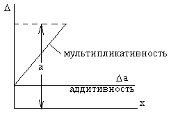 Аддитивные - погрешности в зависимости от изменения измеряемой величины (погрешность нуля). Мультипликативная - линейно изменяется.