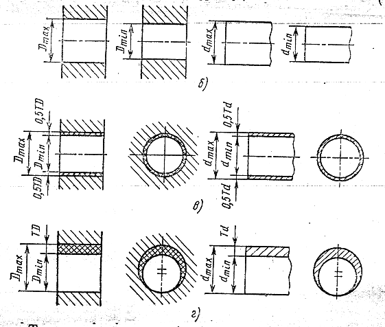 Типовые примеры графического изображения допусков отклонений, номинальных и предельных размеров и других параметров точности отверстий и вала показаны на рис. 4.4а