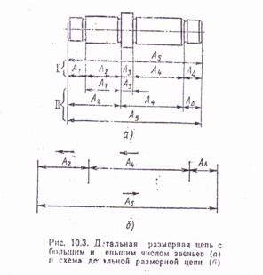 Сборочная размерная цепь – это цепь, звеньями которой являются размеры отдельных деталей. Такая цепь определяет точность расположения заданных поверхностей данной сборочной единицы или всей машины. Размерная схема этой цепи дана на рис. 10.2, б.