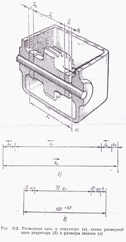 1. Составляем размерную схему РЦ (рис. 10.2, б). Размеры звеньев цепи заданы с предельными отклонениями: А1 = 12-0,3; А2 = 72-0,4; А3 = 12-0,2; А4 = 100