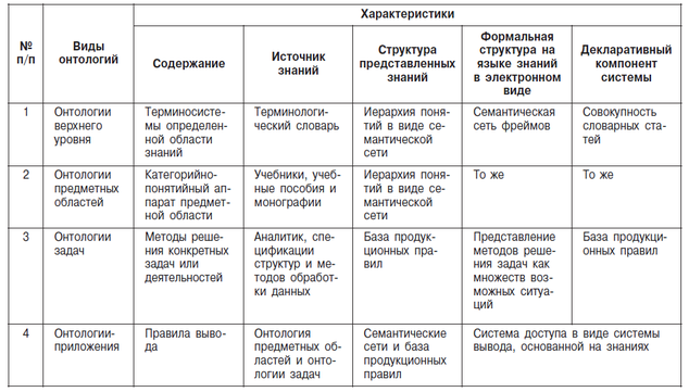 Полное совпадение означает, что понятие носит общенаучный характер и в данной словарной статье необходимо оставить только ссылку на тезаурус, содержащий терминосистему, и все элементы, кроме денотата, следует обнулить. Частичное совпадение означает, что данное понятие тоже носит общенаучный характер, но имеет конкретное назначение для описываемой предметной области. В этом случае необходимо в денотат понятия добавить ссылку на тезаурус, содержащий терминосистему. Полное различие означает, что понятие носит частнонаучный характер и принадлежит только описываемой предметной области. Таким образом, в работе применяются следующие методы исследований. В качестве основного формализма представления знаний используется логика предикатов первого порядка, вспомогательными формализмами являются фреймы, системы продукций, семантические сети. Для построения иерархии на основе исследования семантических и онтологических отношений между понятиями используются методы моделирования понятий и отношений. Семиотическое моделирование для построения иерархии на основе исследования отношений между конкретными предметными областями выполняется на основе методов моделирования онтологических моделей. Средством прототипной программной реализации является комплекс Java-программ. Описание характеристик создаваемых онтологий приведено в таблице 2.