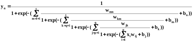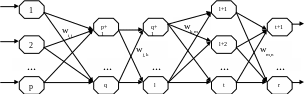 wij, wjk, wkm, wmn – текущие значения коэффициентов весомости синаптических связей при i = 1, 2,…, p; j = p + 1, p + 2,…, q; k = q + 1, q + 2,…, l; m = l + 1, l + 2,…, t; n = t + 1, t + 2,…, r. Значения p, q, l, t, r определяют число нейронов в каждом конкретном слое;