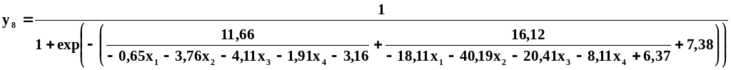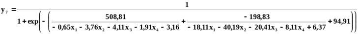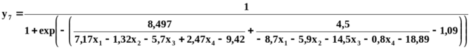 Пример НСММ дефектов отливок для ТП ЛПД, реализованной на базе двухслойной СНС с множественным выходом, сигмоидной функцией активации для обоих слоев нейронов и выходных нейронах №№ 7-12 приведен в (3). В (2) и (3) x1 – температура заливки металла, град. С, x2 –