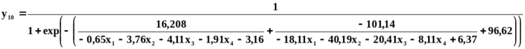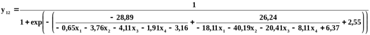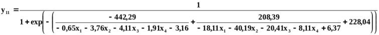 Разработанные формализованные описания позволяют выявлять новые, в том числе нетривиальные закономерности функционирования ТПО, в частности, проявления дефектов отливок, эффективности технологического оборудования и других, в зависимости от неограниченного числа и вида различных факторов. Пример нетривиальной НСММ приемлемости АЛЛ, синтезированной на основе СНС с одним выходом приведен в виде (7).