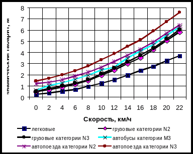 Вначале наблюдается уменьшение значений коэффициентов с того уровня, который определяется только габаритами автомобиля. Затем коэффициент постепенно увеличивается и при достаточно большой скорости стремится к постоянной величине, которая определяется отношением коэффициента при квадрате скорости уравнения динамического габарита. Причем для каждой более тяжелой категории наблюдается смещение минимума коэффициента приведения в сторону большего значения скоростей.