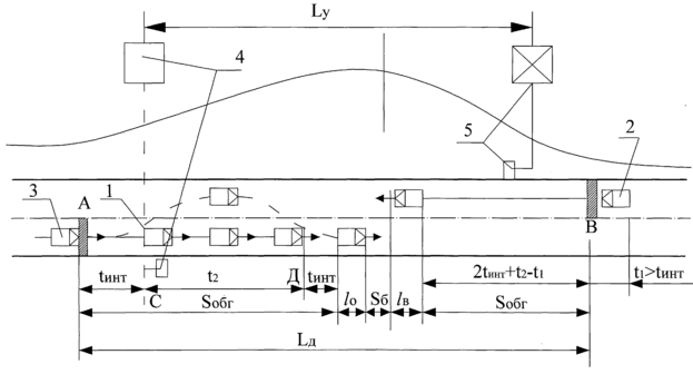 Смена информации производится автоматически от соответствующих датчиков. Расстояние между автомобилями (дистанция) устанавливается в зависимости от принятой скорости движения. Анализ различных вариантов дорожной ситуации, имеющих место на участках дорог с необеспеченной видимостью, показывает, что наиболее неблагоприятным будет следующий (рис. 3.1): по одной из полос первым движется тихоходный автомобиль, за ним с временным интервалом 3 с – быстроходный, водитель которого намерен совершить обгон; по встречной полосе по истечению 3 с от момента прохода тихоходным автомобилем датчика А движется быстроходный.