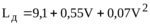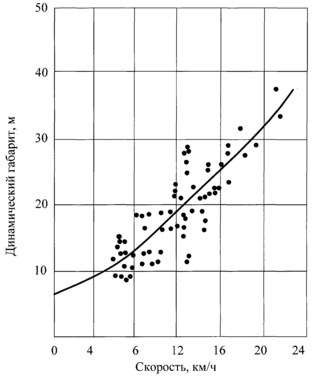 В соответствии с теоретическим анализом нами было выбрано уравнение квадратной параболы. Коэффициенты этого уравнения рассчитаны на основании экспериментальных точек на ЭВМ по программе, основанной на методе наименьших квадратов. В результате такой статистической обработки были получены регрессионные уравнения зависимости динамического габарита от скорости для указанных групп автомобилей. Эти уравнения имеют следующий вид: