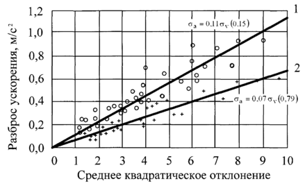Рис. 5.1 – Взаимосвязь среднего квадратического отклонения скорости и разброса ускорений при: 1 – частотном изменении скорости движения; 2 – амплитудном изменении скорости движения (в скобках указаны значения коэффициентов линейной корреляции)