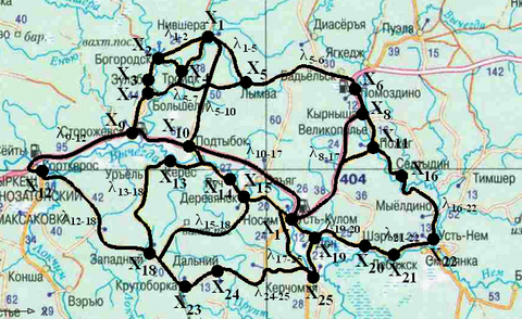Рис. 7.4 – Сетка участков лесовозных автомобильных дорог с вершинами в пунктах заготовки или переработки древесины на примере территории Республики Коми