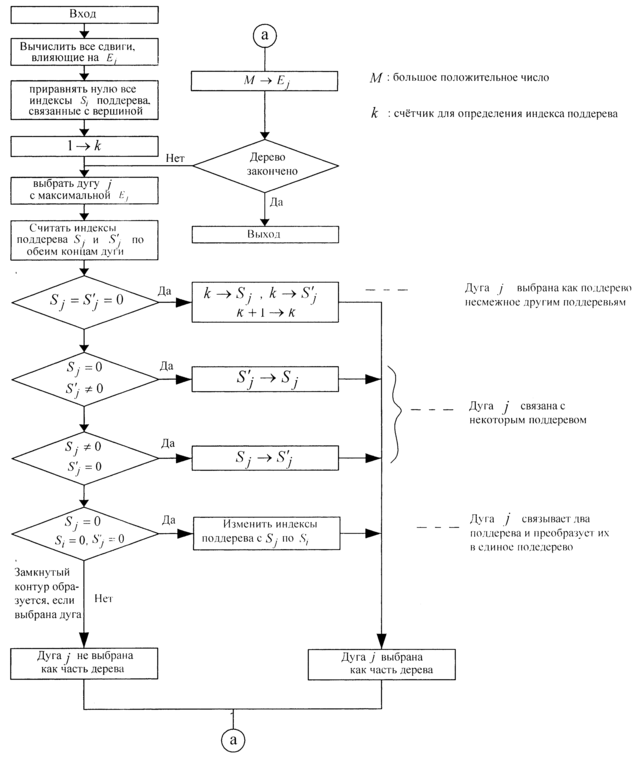 , ассоциированный с каждой вершиной и равный нулю в начале процедуры. Поэтому, когда какая-то дуга выбирается в качестве дуги дерева, выполняется проверка индексов поддерева для обоих концов дуги. Если, по крайней мере, одно из этих чисел равно нулю или если эти числа неодинаковы, то дуга может быть включена в дерево. Когда индексы одинаковы и положительны, то включение дуги в дерево может привести к образованию замкнутого контура.