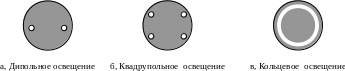 Если освещать шаблон двумя наклонными пучками света, как изображено на рис. 2, то –1 и +1 порядки будут попадать во входной зрачок, таким образом, изображение шаблона будет формироваться. Такой тип освещения называется дипольным, он достигается помещением в оптический тракт осветителя диафрагмы, изображенной на рис. 3(а). Однако, для периодической структуры линий, перпендикулярных к рассматриваемым, данный эффект повышения разрешения не будет распространяться. Поэтому, наряду с дипольным освещением, применяют квадрупольное и кольцевое, изображенные на рис. 3.