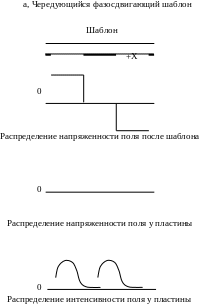 Указанный выше недостаток не возникает при использовании ОФ шаблонов, хотя эффект подавления уширения изображения будет меньшим. Конструкция шаблона состоит в том, что темные участки шаблона не полностью не пропускают излучение, а ослабляют его интенсивность и сдвигают фазу таким образом, что на выходе из шаблона излучение от темных участков сдвинуто по фазе на относительно излучения от светлых участков, как изображено на рис 4(б). Для случая, изображенного на рисунке, в профиле распределения интенсивности излучения на поверхности пластины есть две точки, где интенсивность равна нулю. Для сравнения, пунктирной линией изображены профили, соответствующие аналогичному традиционному шаблону, в котором темные участки не пропускают излучение. Основываясь на идее, приведенной в данном примере, с использованием ОФ шаблона возможна проработка периодической структуры “темная полоса/светлая полоса” с меньшим периодом, чем минимально возможный при использовании обычного шаблона.