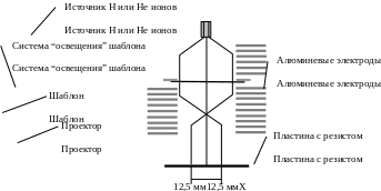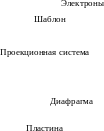 Проект SCALPEL разрабатывается фирмой Lucent Technologies, США. [9]. Аббревиатура SCALPEL расшифровывается как электронная проекционная литография при рассеянии с угловым ограничением. Изображение кристалла формируется путем поочередной печати сегментов кристалла размером 0,250,25 мм. Печать сегмента осуществляется сканированем полосой шириной 0,25 мм на пластине; движущимися являются шаблон и пластина. Проекционная схема изображена ниже: