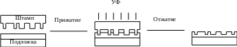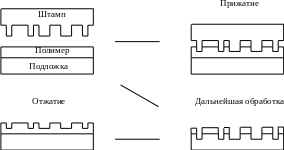 Данная технология рассматривают как возможный способ литографии для изготовления микросхем с минимальным размером элемента 20-40 нм [14]. Метод основан на формировании оттиска в тонком слое полимера соответствующим штампом при поддержании фиксированной температуры и давления, рис.7: