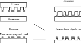 На прижимаемые участки штампа наносят вещество, которое становится мономолекулярной структурой при контакте с подложкой. Данный монослой может служить либо маской при дальнейшей обработке, как изображено на рисунке, либо быть частью изготавливаемой микросхемы, как и в Imprint.