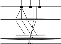 Источник испускает ионы водорода или гелия. Далее, с помощью мультиэлектродных электростатических систем осветителя и проектора ионный пучок расширяется, проходит через шаблон трафаретного типа (см. рис.4) и проецируется с уменьшением на пластину с резистом. Столь большой размер кадра достигнут вследствие уменьшения кривизны поля изображения при использовании шаблона как электрода. При этом, как изображено на рис. 6, образуется расходящийся пучок ионов (технология отклоняющих электростатических линз, демонстрировалась Ionen Mikrofabrikations Systeme GmbH в 1996/97 гг.):
