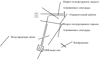 Нормально-исходящее от осветителя излучение с λ=193 нм (предполагается, что используются имеющиеся осветители, без технологии внеосевого освещения) проходит через первое полупрозрачное зеркало и нормально падает на отражательный шаблон. Отходящее от шаблона излучение отражается от первого полупрозрачного зеркала и проходит через второе полупрозрачное зеркало. Для более широкого захвата излучения, что будет увеличивать интенсивность изображения и увеличивать числовую апертуру схемы, перед ОВФ-веществом стоит линза. Линза фокусирует излучение на вещество. После обращения ОВФ-веществом свет распространяется назад через линзу, отражается вторым полупрозрачным зеркалом и формирует в некотором месте изображение шаблона. Масштаб формирования изображения у предлагаемой схемы 1:1. Для схемы не ограничивается диаметр кремниевых пластин.