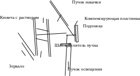 Для достижения эффекта ОВФ чрезвычайно важна высокая сонаправленность прямого и обратного пучков накачки. Отклонение зеркала на рис. х в несколько микрорадиан сводило к нулю интенсивность обращенного пучка. Зеркало было помещено на прецизионном регулировочном столике и большой угол падения пучка накачки на грань кюветы (рис. 2) обусловлен облегчением регулировки положения зеркала.