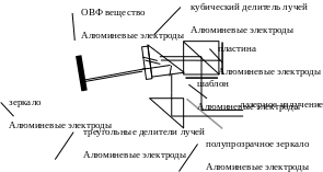 Вследствие большого коэффициента усиления излучения лазером, он был удален на несколько метров от проекционного блока схемы, изображенного на рисунке 3. При этом понижалась интенсивность второго пучка накачки, отраженного зеркалом, на входе обратно в лазер. Кроме того, на выходе лазера была установлена поляризационная пластина, а между ОВФ-веществом и зеркалом ромб Френеля, не изображенный на рисунке, дававший поворот направления поляризации 90 при двойном проходе.