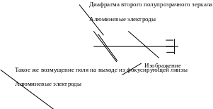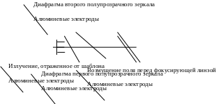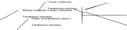 Часть эквивалентной оптической схемы от шаблона до первого полупрозрачного зеркала будет выглядеть, как изображено на рис. 13. При отражении в зеркале мнимое положение шаблона находится симметрично самому шаблону относительно плоскости зеркала. По рисунку видно, что распространение излучения ограничено самим столиком с шаблоном. Данный эффект объясняется тем, что первое полупрозрачное зеркало отражает излучение, отошедшее от шаблона и распространению отраженного излучения уже мешает столик с шаблоном. Это видно из рис. 14, на котором изображена часть реальной предлагаемой схемы литографии.