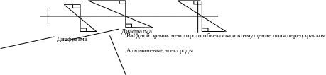В предлагаемой схеме формирования изображения, полупрозрачные зеркала, фокусирующую линзу и вещество, обращающее волновой фронт, можно рассматривать как некий объектив. Фокусирующая линза и ОВФ-вещество эквиваленты линзам, формирующим изображение, а полупрозрачные зеркала выполняют функцию диафрагм, ограничивающих волновой фронт. Согласно [28], в любом объективе свет можно считать распространяющимся по законам геометрической оптики. В таком случае можно считать, что, проходя фокусирующую линзу и попадая на ОВФ-вещество и, далее, исходя из ОВФ-вещества и проходя назад через фокусирующую линзу, излучение распространяется по законам геометрической оптики. Полагая, что на ОВФ-вещество фокусируется весь свет, прошедший через фокусирующую линзу, обращенное излучение отличается по амплитуде от падающего лишь на некоторую константу. Полагая, что в фокусирующей линзе отсутствует поглощения излучения, получаем, что на выходе из фокусирующей линзы возмущение электромагнитного поля будет отличаться от входящего возмущения на упомянутую константу. Таким образом, вся вместе система, состоящая из фокусирующей линзы и ОВФ-вещества, является обращающей волновой фронт, а распространение излучения в предлагаемой схеме можно изобразить следующими рисунками: