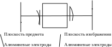 Таким образом, при построении изображения любого предмета дифракционно-ограниченной линзой с увеличением М=-1, волновой фронт излучения будет симметричен относительно центра линзы, что можно представить обращением волнового фронта относительно плоскости линзы. Следовательно, построение изображения с помощью обращения волнового фронта неким ОВФ-объектом равносильно построению изображения дифракционно-ограниченной линзой с М=-1 и формой ОВФ-объекта. Предлагаемая схема формирования изображения может быть изображена следующей эквивалентной схемой: