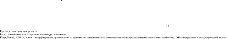 Некоторые значения в формуле 8.1 можно легко определить. Доза облучения резиста полагается равной типичному для 193нм-литографии значению Eрез=20 мДж./см2. KОВФ оценивается единицей, поскольку, например, при ВЧВС коэффициент передачи бывает больше единицы, а при ВРМБ, где только один пучок света, коэффициент заведомо меньше единицы. Kлин1 вследствие того, что материалом линзы может быть либо SiO2, либо CaF2, а оба данных материала прозрачны на 193 нм.