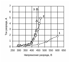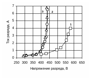 Вольтамперные характеристики исследовались при различных давлениях рабочего газа р (аргон) и различных величинах индукции магнитного поля на поверхности катода В0. Рассматривалась максимальная величина параллельной поверхности катода составляющей поля В. Примеры ВАХ приведены на рис.3.
