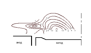 Рис.7. Распределение концентрации плазмы nех10-16 м-1 в разрядном промежутке магнетронной распылительной системы МРС №1