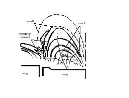 Рис.4. Влияние конфигурации магнитного поля на форму разряда в МРС. (соотношение числа ампервитков в основной и компенсационной катушке К=8): а) конфигурация магнитного поля; б) форма разряда