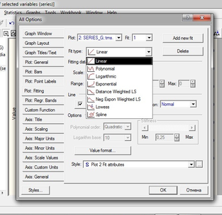 Для ее инициализации необходимо навести мышь на поле графика и дважды кликнуть по нему. В появившемся окне выберем закладку Plot: Fitting. Имеются модели: линейные, полиноминальные и т. д. (Рисунок 13). Для создания новой модели необходимо нажать Add new fit вверху рабочего окна. Выберем экспоненциальную модель. Нажмем ОК. На графике ВР и его SMA появляется экспоненциальная модель сглаживания