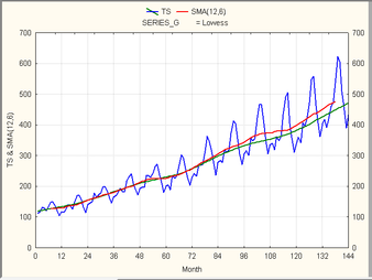 Для прогнозирования данных необходимо знать их статистические характеристики. Одной из статистических характеристик является математическое ожидание или тренд. Для формирования модели тренда по одной реализации в пакете «STATISTICA» имеются параметрические и непараметрические методы. К непараметрическим моделям относят скользящие средние. Они имеют известный недостаток, а именно, центрированная модель, наиболее точно описывающая процесс, не охватывает граничные сегменты данных. Для устранения этого недостатка применяют параметрические модели аппроксимации НВР. В пакете «STATISTICA» имеется богатый выбор параметрических моделей: линейная, экспоненциальная, полиномиальная, а также несколько более интеллектуальных моделей, например, модель Lowess.